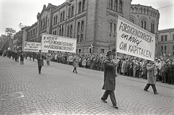 1. mai 1968 i Oslo.Demonstrasjonstoget i Karl Johans gate.Parole: Forsikringskrigen en krig om kapitalen.Parole: Vi krever full demokratisering av forsikringsvesenet..