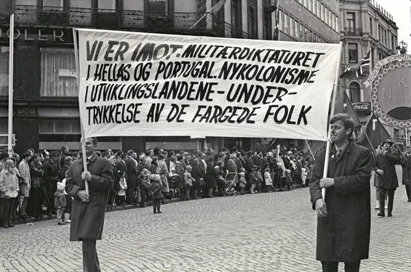 1. mai 1969 i Oslo.Demonstrasjonstoget i Karl Johans gate.Parole: Vi er i mot militærdiktaturet i Hellas og Portugal. Nykolonisme i utviklingslandene - .undertrykkelse av de fargede folk