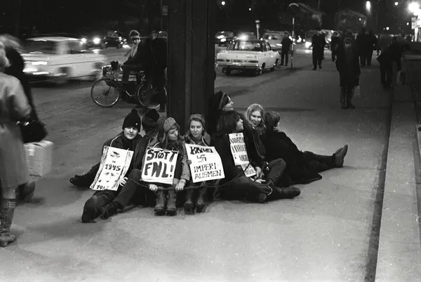 Demonstranter utenfor den amerikanske ambassaden på Drammensveien (Nå Henrik Ibsens gate 48). Demonstrantene var lenket sammen og bar plakater med støtte til frigjøringsfronten i Vietnam (FNL). Desember 1967