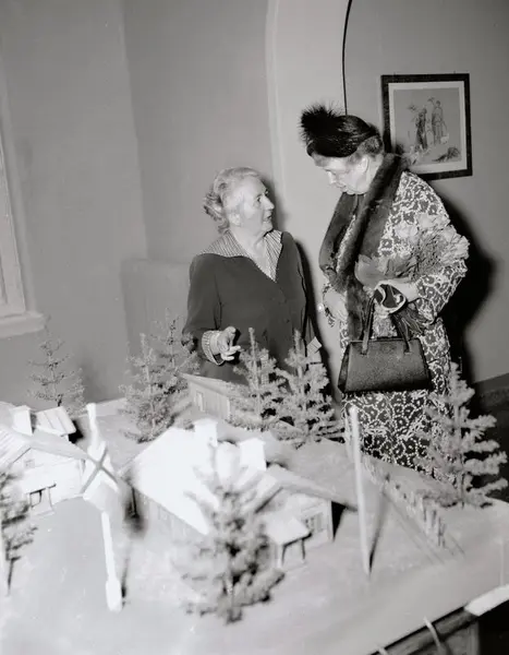 Eleanor Roosevelt besøker Sagene Skole. Til venstre: skolens overlærer Katrine Arnesen med en modell av Norges første leirskole "Vesle Sagene". Juni 1950