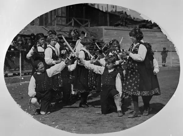 1. mai 1925, fra barnestevnet på Bislett stadion. Leikarring fra et barnelag som opptrer med dansespillet "Falkvor Lommanson" (Sverddansen, Fakkeldansen).