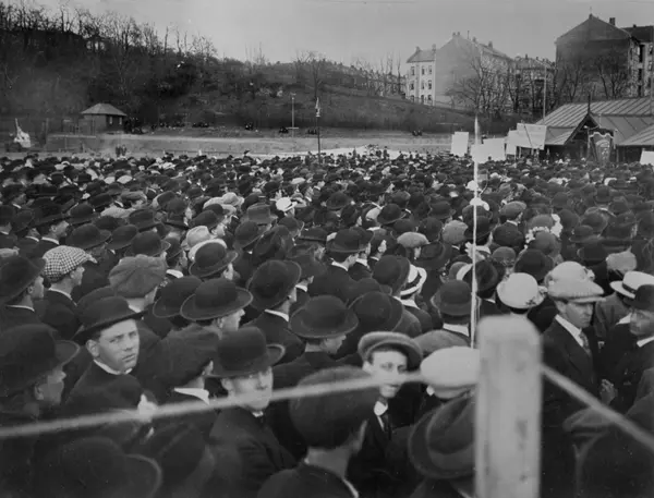 1. mai 1915 på Bislett stadion. I alt var 30.000 mennesker samlet på Bislett stadion, 15.000 av disse hadde deltatt i 1. mai toget. Dagen var preget av antimilitaristiske paroler og protester mot voldgiftsloven.