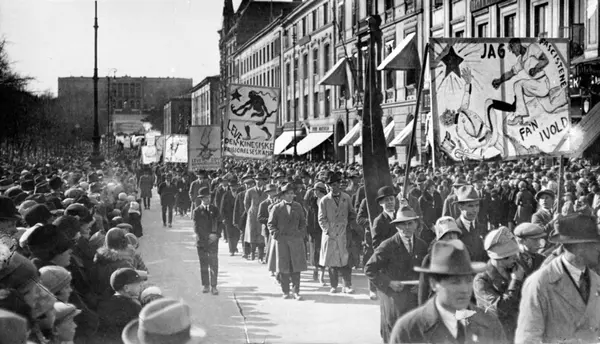 1. mai 1926, demonstrasjonstoget på vei nedover Karl Johans gate. Paroler: Jag fascistene fa'n ivold! - Leve den kinesiske frigjørelseskamp! - Leve den kommunistiske Internasjonale!