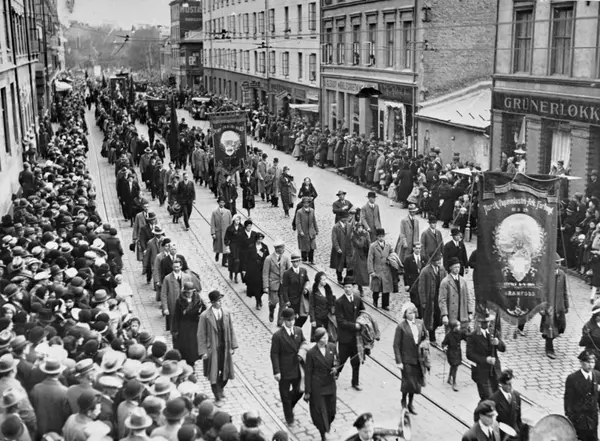 1. mai i Oslo, 1933. Demonstrasjonstoget på vei oppover Thv. Meyersgate på Grünerløkka. Vi ser en del av seksjonen til Lilleaker samvirkende fagforeninger. I forgrunnen avd. 29 av Norsk Papirindustriarbeiderforbund, Granfoss.