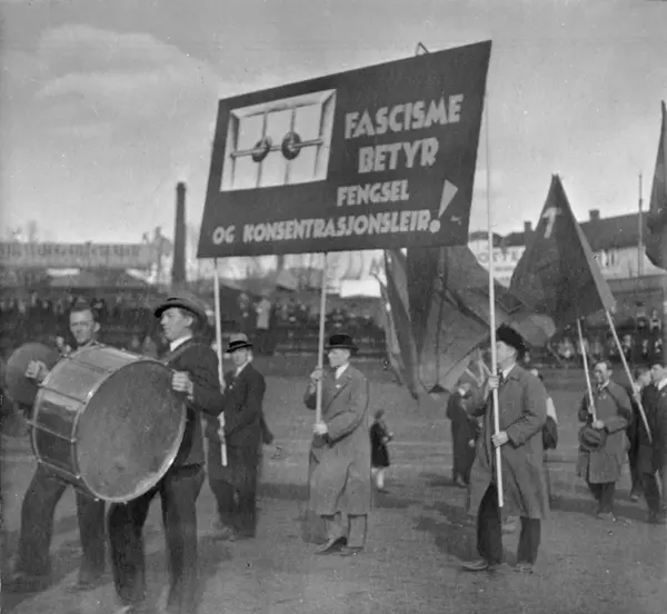 1. mai i Oslo, 1935. Demonstrasjonstoget marsjerer inn på Dælenenga stadion, det avslutningsarrangementet skal holdes. Parole: Fascisme betyr fengsel og konsentrasjonsleir!