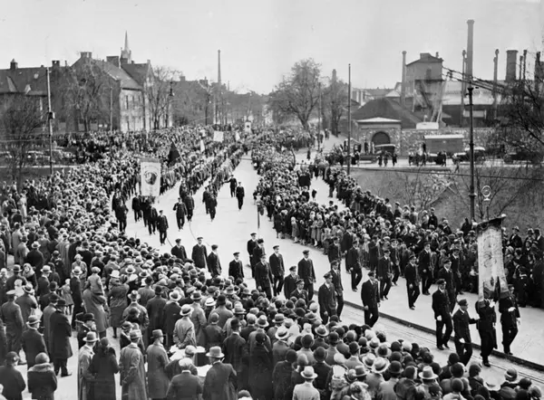 1. mai i Oslo, 1933. Telegraforganisasjonenes seksjon passerer Nybrua på vei til Dælenenga. I bakgrunnen til høyre ser vi Gassverket. Bak fanen helt til høyre går Telegrafavdelingen, Norsk Telefon- og Telegrafforbund, deretter følger Telefonmontørenes forening.
