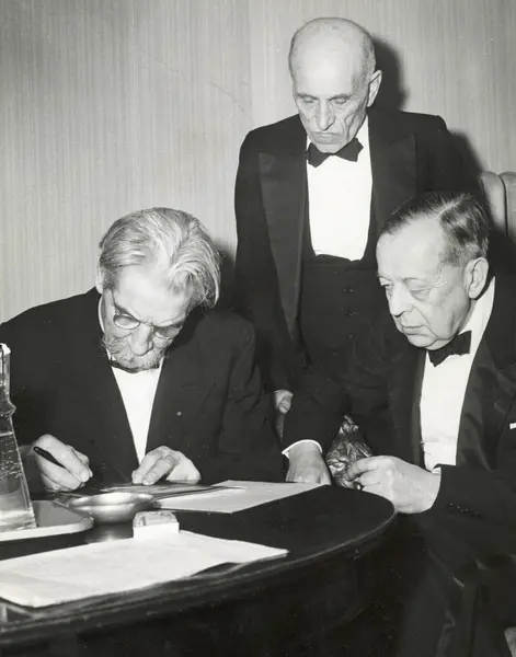 Albert Schweitzer (Nobels fredspris 1952.) i Oslo for å holde sitt nobelforedrag, november 1954. Her sammen med Martin Tranmæl (stående) og Gunnar Jahn