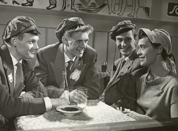 Stillsfoto fra Edith Carlmars spillefilm Bedre enn sitt rykte. .Odd Borg, russepresident Jan Halvorsen, Magne Bleness og fransklærerinnen Kari Nordseth på Russekroa (Dovrehallen). Russefeiring.