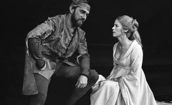 Nationaltheatret. Hovedscenen..NARREN OG HANS HERTUG av Stein Mehren. .Premiere: 16.01.1969..Espen Skjønberg i rollen som Hans van Nicklashausen og Henny Moan som Flora.