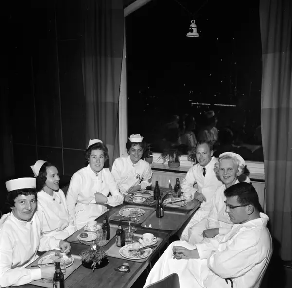 Legevakten. Julefeiring for leger og sykepleiere julekvelden. Bildetekst: En liten pause for lege og sykepleiere på Legevakta julekvelden. Fra venstre: Søster Ingvarda, søster Trine, søster Kari og søster Siv. Foran til høyre lege Levin, søster Ruth og sykepleier Engebretsen..Desember 1965
