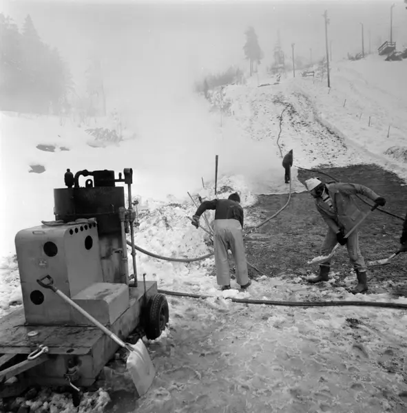 Linderudkollen. Bildetekst: Plastbakken på Linderudkollen skulle egentlig vært hoppklar, men snøen har forsinket framdriften. Nå arbeider skogvesenets folk på spreng for å tine bort snøen så plasten kan legges. Oktober 1976