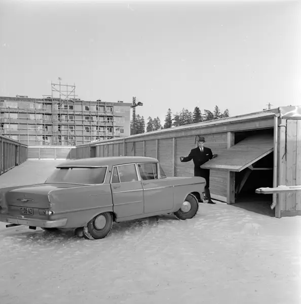 Manglerud. Direktør Odvar B. Solberg åpner porten til en av garasjene i det anlegget på Manglerud som nå skal tas i bruk. I bakgrunnen en av blokkene til Rognerud borettslag, det første byggeanlegget som får garasjer stilt til disposisjon allerede den dagen innflytting skjer i leilighetene. November 1962