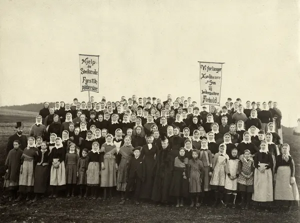 Fyrstikkarbeiderstreiken i oktober 1889, da jentene ved fyrstikkfabrikkene Bryn og Grønvold la ned arbeidet. Til venstre i flosshatt: Carl Jeppesen. Damen til høyre i midten er Hulda Jeppesen.