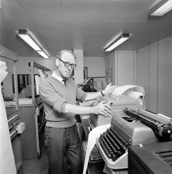 Pressens Hus. Et senter for norsk nyhetsformidling..Fjernskriveroperatør Jan Arnesen sørger for at de norske.avisene får nyhetene på sine fjernskrivere. Februar 1967