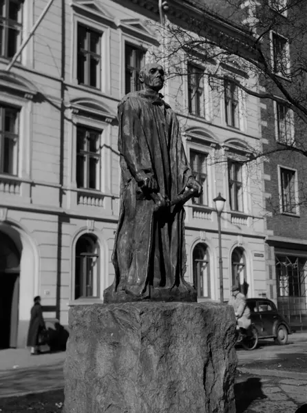 Solli plass. Mannen med nøkkelen. Skulpturen er lager av den kjente franske billedhuggeren, Auguste Rodin og inngår i hans verk,"Borgerne fra Calais" April 1951