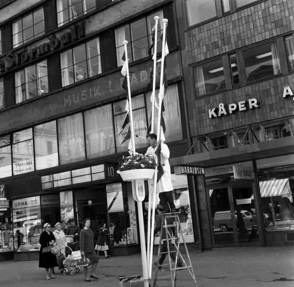 Storgata vel pynter med blomster. "Når Storgata alt i Mai kan vise et så vakkert blomsterflor, skyldes det denne gangen et intimt samarbeid med kunststoffet plast". April 1960