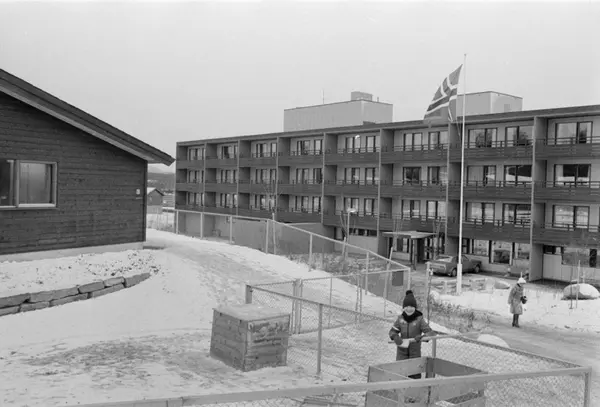 Stovner sykehjem. Morten Reinli i forgrunnen i Stovner sykehjems daghjem, bakenfor en del av anlegget som skal tjene de eldre både som sykehjem og som dagsenter. Desember 1976