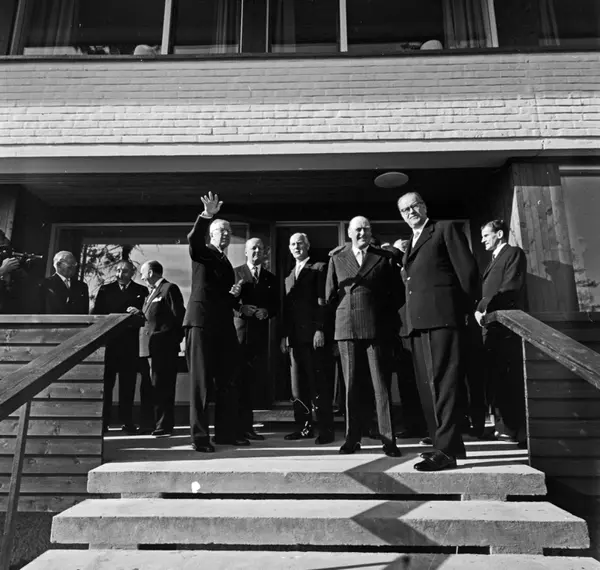 "Voksenåsen", Norges nasjonalgave til det svenske folk, innvies. To konger og to statsministre beundrer utsikten fra trappa på "Voksenåsen", Norges takk til det svenske folk. Oktober 1960