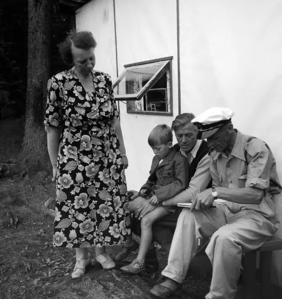 Georg Larsen og familie tilbringer sommerferien på Nordre Langåra i en 9 kvadratmeter stor hytte laget av papp. Vaktmann Rolf E. Nilsen er på besøk for å ta opp "manntal". Juli 1954
