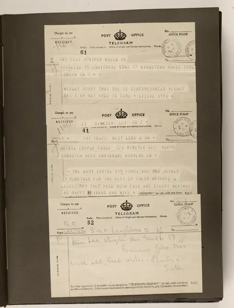 Album laget av Sissel Lie, gift Fosse og senere Bratz (1922-1983). Foto og utklipp fra tiden hun tjenestegjorde i Den norske hærs kvinnekorps i Storbritannia under andre verdenskrig. Hun oppnådde graden fenrik i kontrolltjenesten. Albumet har tittelen Sissels Scrapbook fra 1944-45. Side 44: Gratulasjoner og lykkeønskninger sendt til brudeparet Sissel Lie og Gunnar Fosse.