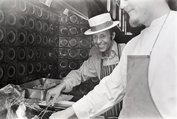 Innehaver av restauranten La P'tite Cuisine, Ben Joseph eller Niels Manuel Jaquesson (til venstre) og kokken Lorde Henry i grillen på La P'tite Cuisine. Juli 1969
