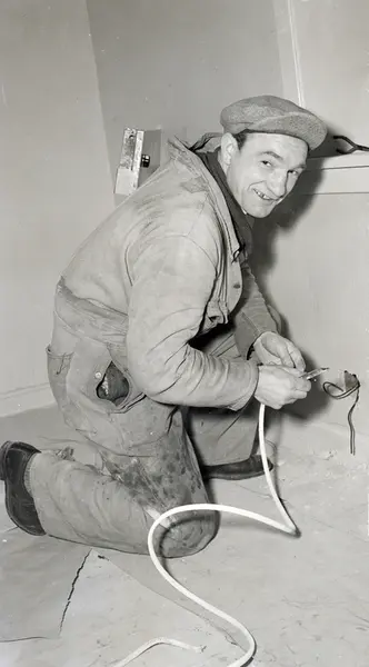 739 familier i Oslo får melding om at de er tildelt leiligheter i bygg som OBOS fører opp. Elektriker Henrik Strasz monterer panelovner. Desember 1948.