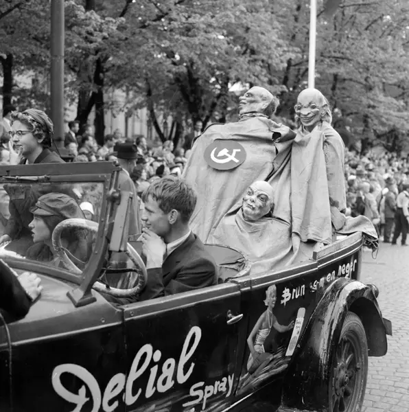 Russefeiring. Russebiler. Russetoget, 17. mai 1959. Maskene skal forestille Charles de Gaulle, Winston Churchill, Nikita Khrusjtsjov (med hammer og sigd) og Dwight D. Eisenhower.