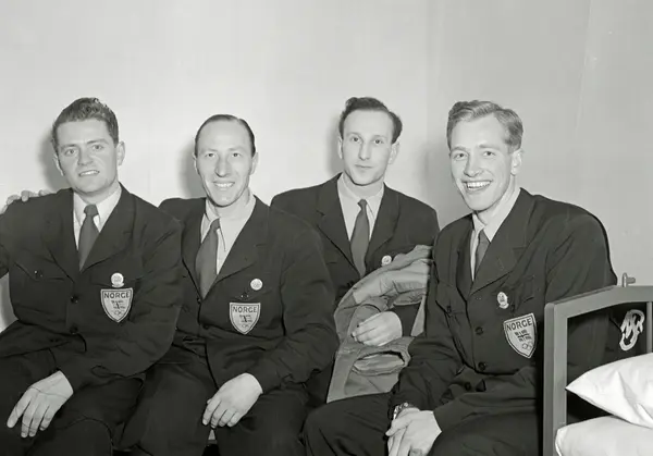 Olympiske vinterleker i Oslo 1952. Det norske hopp-landslaget. Representert ved (f. v.): Arnfinn Bergmann, Arne B. Christiansen (lagleder), Arne Hoel og Halvor Næs.