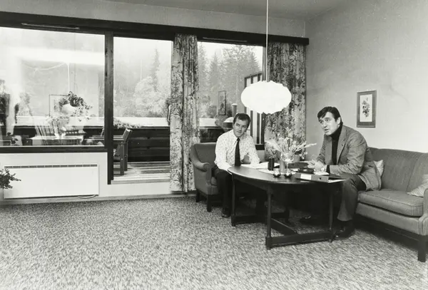 Ljan. Terrasseleiligheter i Herregårdsveien. Nok av intresserte kjøpere forteller assisterende direktør Geir Storeng (t.v.) og advokat Jan von Porat. Oktober 1978