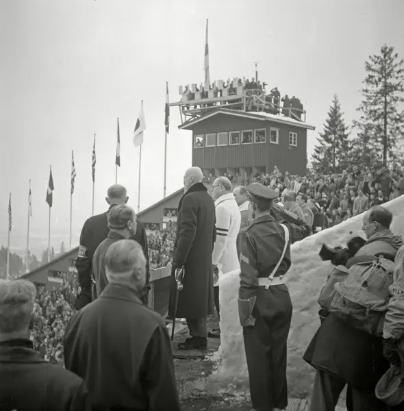 Vinter-OL 1952. De sjette olympiske vinterleker, arrangert i Oslo, 14.-25. februar 1952. På bildet sees Kong Haakon VII, president i den internasjonale olympiske komité, Avery Brundage og Kronprins Olav på tribunen i Holmenkollen. Med filmkamera: Finn Bergan.