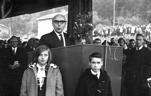 Tunnelbanen. Brynjulf Bull åpner Grorudbanen. Marit Engborg og Tom Holden fikk overlevert Grorudbanen fra ordfører Brynjulf Bull. Fra befolkningen takket de unge med blomster.