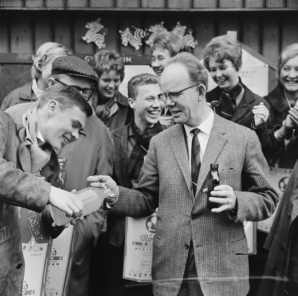 Elever fra Latin-linjen på Kristelig Gymnasium arrangerte trandrikkingskampanje høsten 1962. Lektor Helge Hallesby (1914-2015) var hovedtaler og priste både tranens misjon og elevenes tiltak. Senere byrådsleder i Oslo, Hans Svelland (H) sjenker tran. Reklame for Møllers tran.