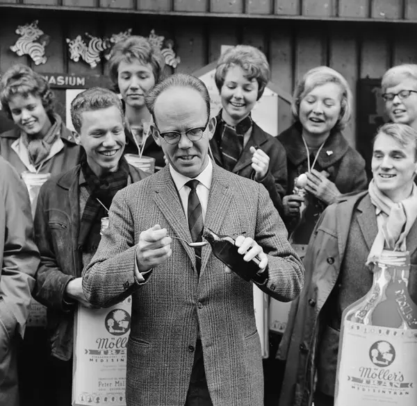Elever fra Latin-linjen på Kristelig Gymnasium arrangerte trandrikkingskampanje høsten 1962. Lektor Helge Hallesby (1914-2015) var hovedtaler og priste både tranens misjon og elevenes tiltak. Reklame for Møllers tran.