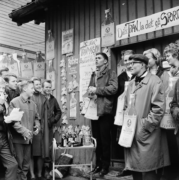 Elever fra Latin-linjen på Kristelig Gymnasium arrangerte trandrikkingskampanje høsten 1962. Lektor Helge Hallesby (1914-2015) var hovedtaler. Midt på bildet står den senere byrådslederen i Oslo, Hans Svelland. Reklame for Møllers tran.
