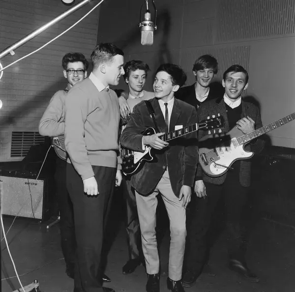 Den danske pop-gruppen The Thaps i studio på Marienlyst med NRK's Vidar Lønn-Arnesen. I midten står Ole Neumann, kjent som Lille Per i de danske Far til fire-filmene. Desember 1965.