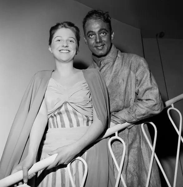 Inger Lise Petersen og Ola Neegaard ved musikklinjen på Nissen skole oppfører utdrag fra operaen Tryllefløyten i Aulaen på Marienlyst skole. Mars 1958.