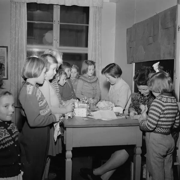 Fritidsaktiviteter for elevene ved Sagene Skole. "Stikk-innom-klubben" frister med forskjellige tilbud etter skoletid. "Frøken Engen og frøken Høgh leder dukkesyklubben". November 1957.