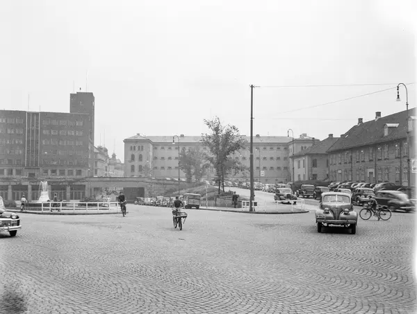 Arne Garborgs plass. Til venstre, Oslo Hovedbrannstasjon og fengselet tilhørende Møllergata 19 med luftegård ut mot Grubbegata. Til høyre Empirekvartalet i Akersgata. September 1948.