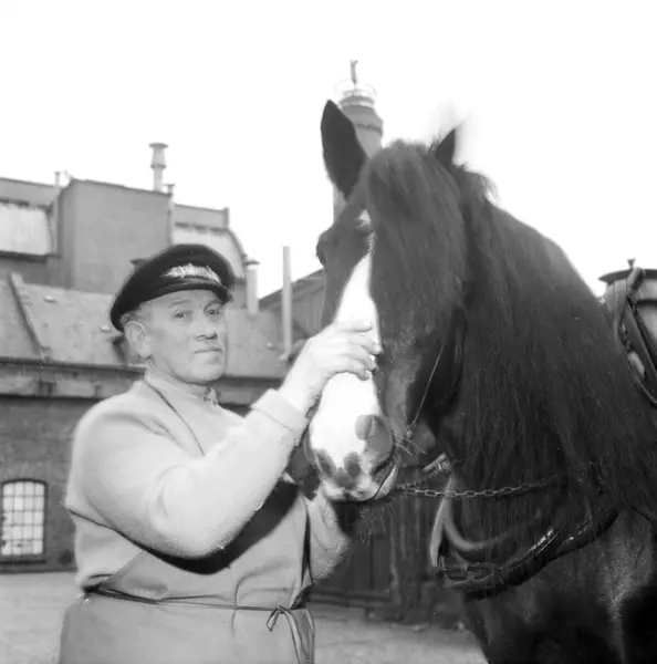 Bryggerihestene på Frydenlund skal ut for siste gang gjennom byens gater. Stallmester Iversen gjør klar gampen "Baronen" før æresrunden. 29. Oktober 1952