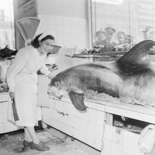En delfin som hadde satt seg fast i fjæresteinene utenfor Drøbak, havnet på midlertidig utstilling i vinduet til fiskehandler Erling Moe på Youngstorget. Borgny Larsen med øks. Oktober 1957.