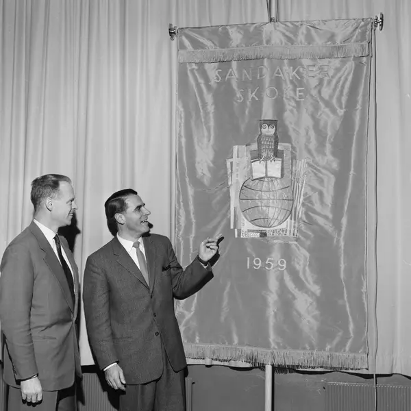 Avdukingen av ny fane til Sandaker skole. Formannen i foreldreforeningen, Willy Hogseth (til venstre) og skolens rektor, Hjalmar Seim. Skiftet navn til Nordpolen skole i 2011. Desember 1960.