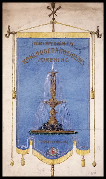 Skisse til fane for Kristiania Rørlæggerarbeidernes Forening. Stiftet 17 desember 1884. Oslos (Kristiania) kommunevåpen nederst på fanen. Skissen er signert Carl Lunde.