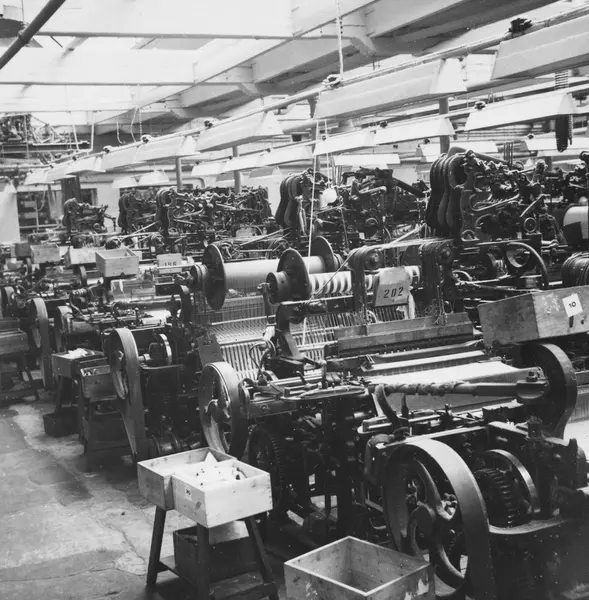 "Hjula - fabrikk med tradisjoner. I denne salen larmer 250 vevstoler dagen lang". Billedreportasje fra Hjula Væverier i Magasinet for Alle, september 1954.
