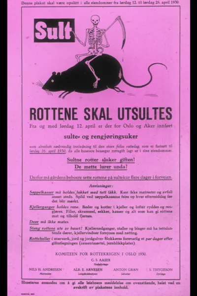 Plakat - Rottene skal utsultes. Komiteen for Rottekrigen 1930. Lysbilde sannsynligvis benyttet i foredrags- og informasjonsvirksomhet i bekjempelse av rotteplagen.