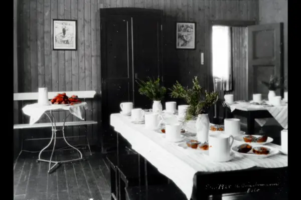 Bord dekket til skolefrokost, oslofrokost? Fra Sandaker friluftsskole? Bildet datert 24.11.1925. Håndkolorert (de grønne kvistene på bordet og maten på bordene).