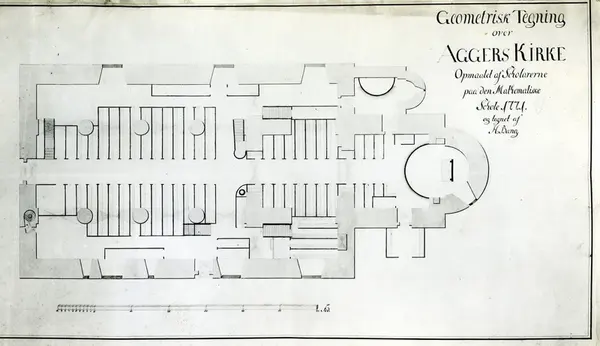 Planskisse over Gamle Aker kirke. Tegning med påskrift: Geometrisk tegning over Aggers Kirke . Opmaalet af Scholarerne paa den Matematiske Scole 1771 og tegnet af H. Bang.