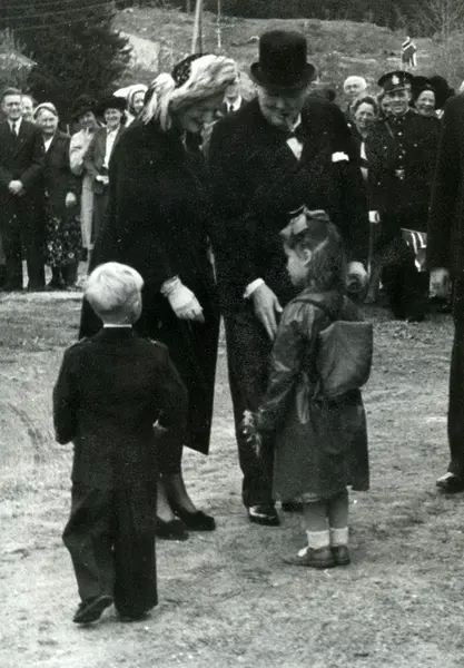 Statsminister Winston Churchill og Mrs. Churchill mottar blomster av barn ved besøk i Oslo 13. mai 1948. Feststemte tilskuere med norske flagg i bakgrunnen. Bildet er trolig tatt på Frognerseteren.