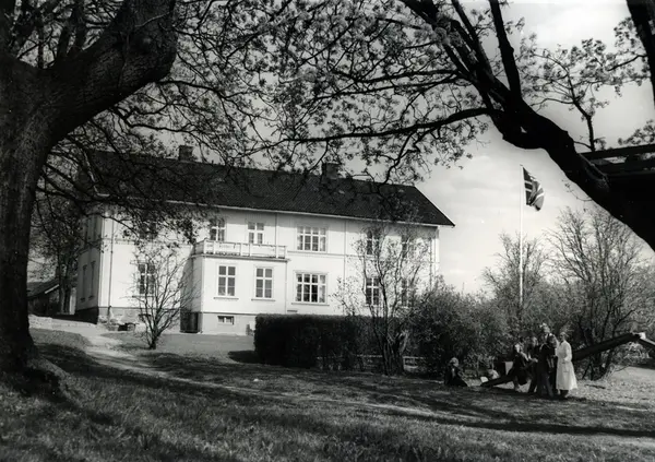 Barn og barnepleierske i hagen ved det tidligere våningshuset på gården Frydenberg. I dag Aline og Frydenberg barnevernssenter (Fosterhjemstjenesten) Frydenbergveien 37. Flaggstang