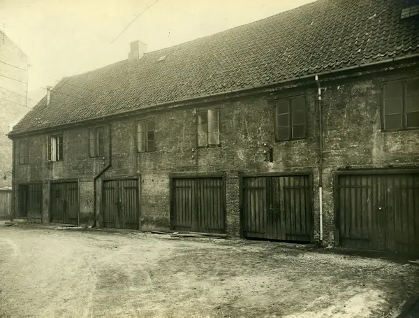 Baksiden av gammelt bindingsverkshus i Nedre Slottsgate ved siden av Garnisonssykehuset. Bakgård. Bygningsporter. Forsiden av bygningen ses på bilde A-10001/U/008/009. Revet.