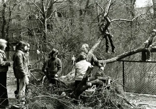 Elever med lærer feller gammelt tre og samler kvist og kvas. Fra "Aksjon Spire 1973" på Uranienborg skole på området mellom Harelabbveien, Briskebyveien og Skovveien (lokalnavn "Harelabben" etter planten harelabb).